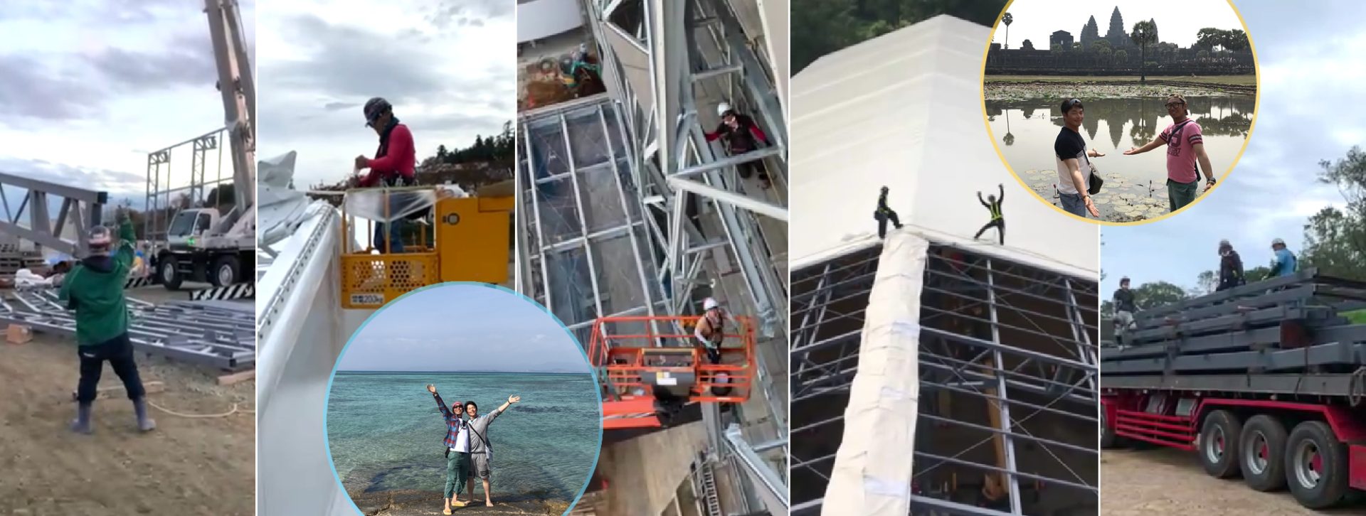 日本全国の現場で業務用テントの施工が当社の主業務です。鉄骨から組み立て、テントを張ります。